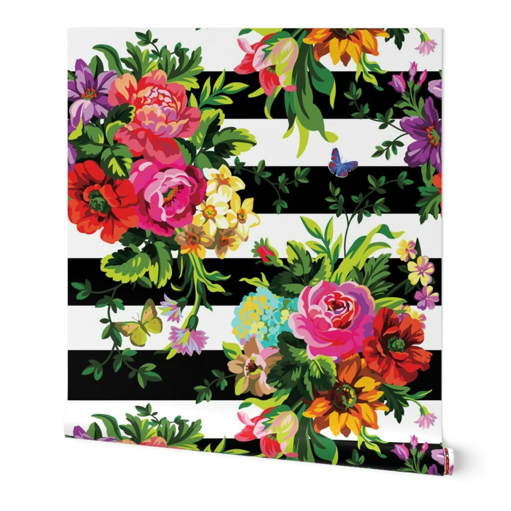 Colorful Flowers with Black White Stripe Patterned Wallpaper Mural